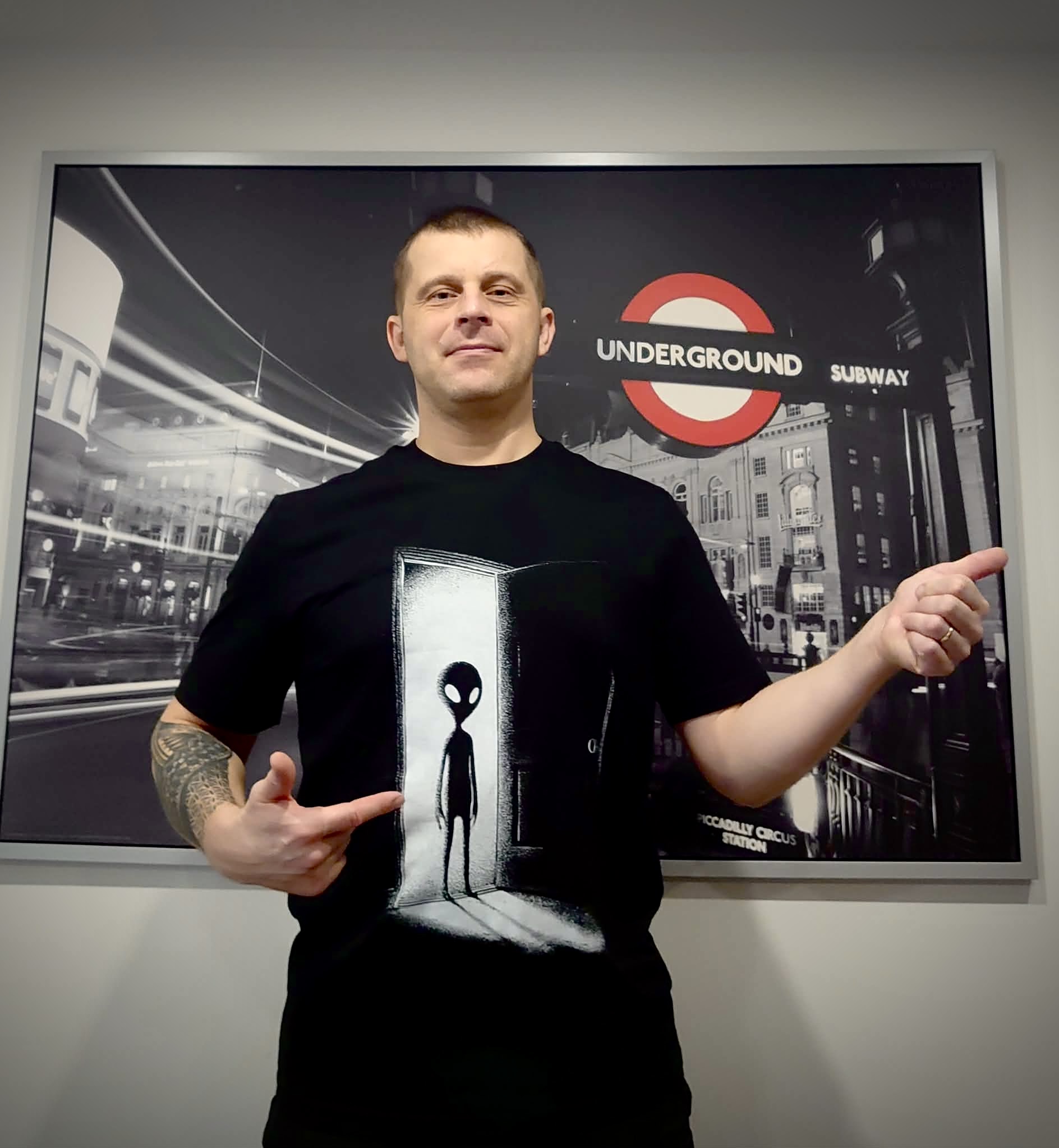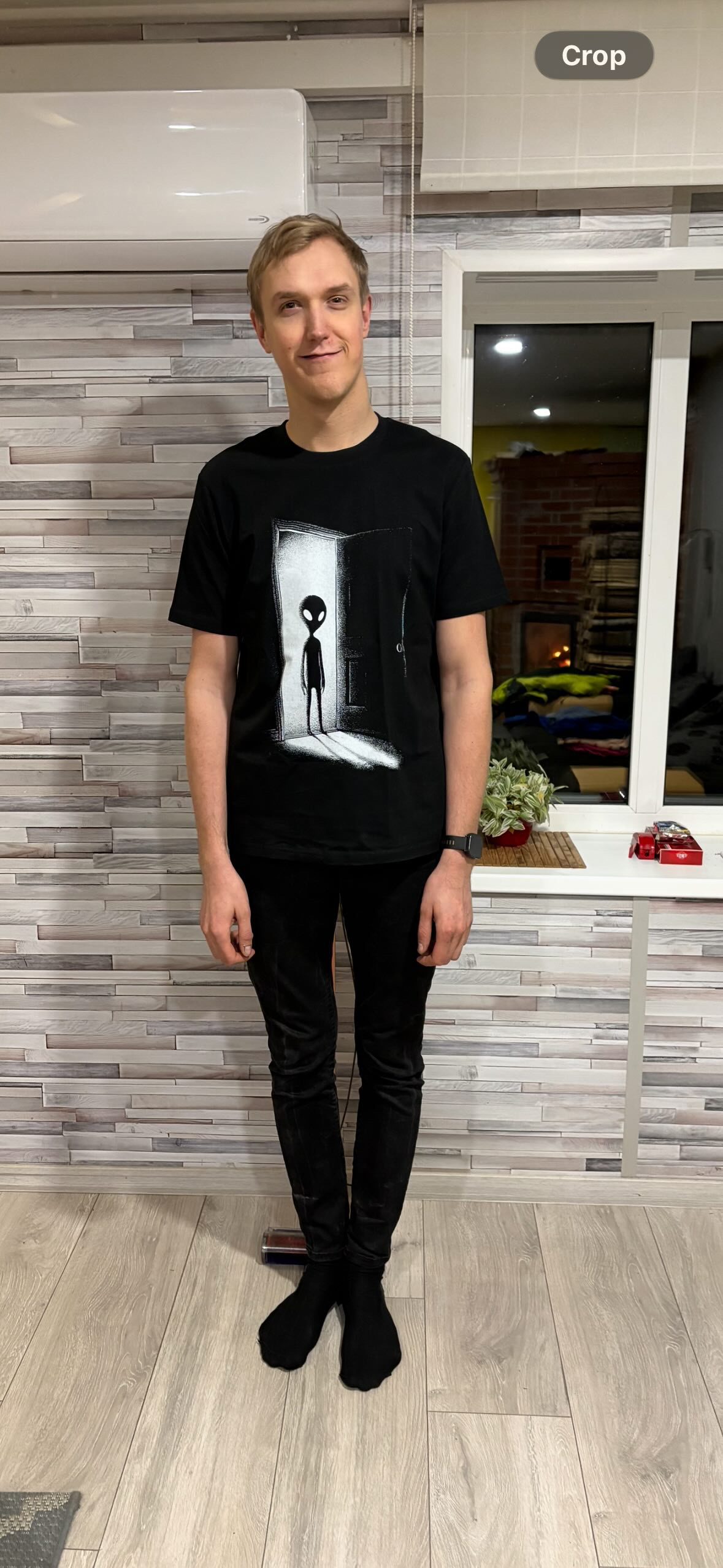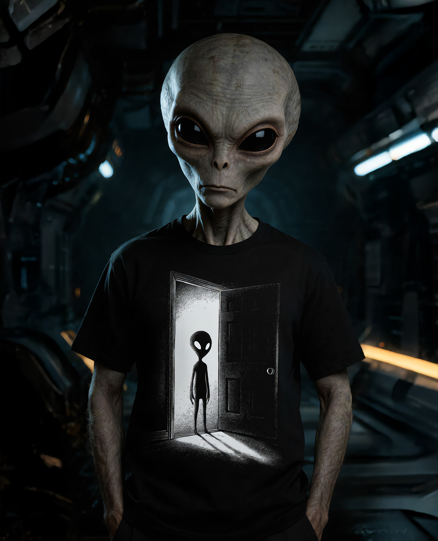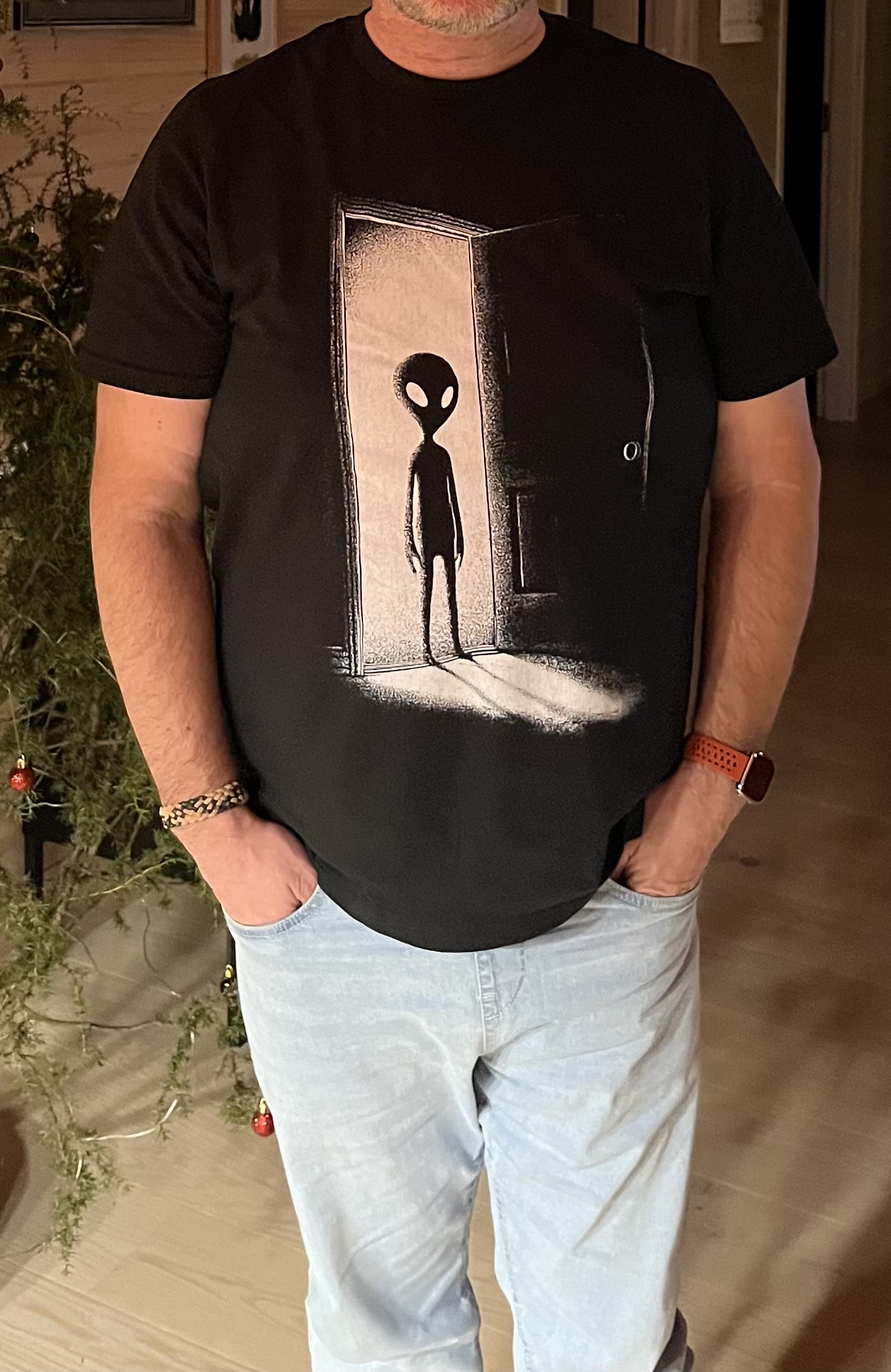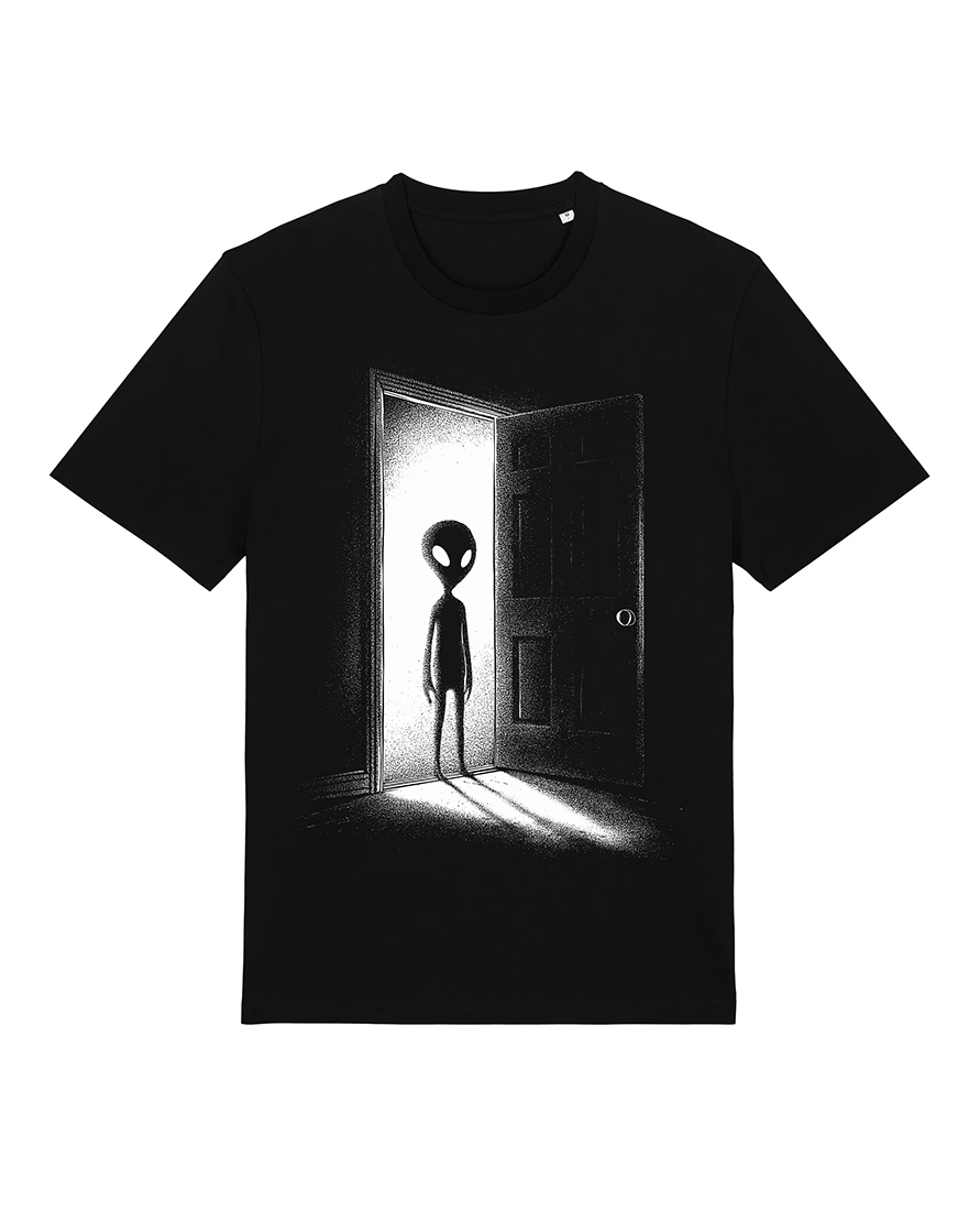 T-Särk Külaline UFO. Detailne DTG print, rinnal külaline tulnukas ning seljal väike tekst ufodisko koos logoga. Klassikalise lõikega mugav ja kvaliteetne särk, 100% orgaaniline puuvill, unisex, 180 gms.
