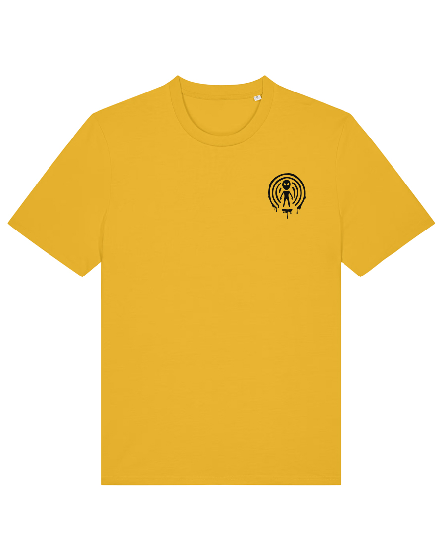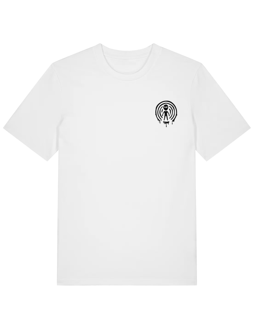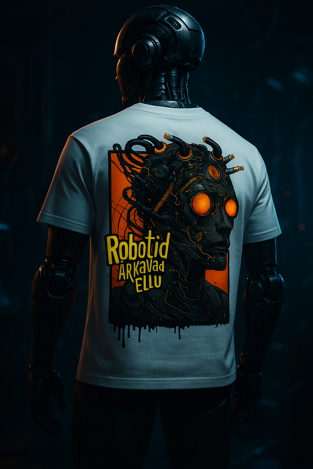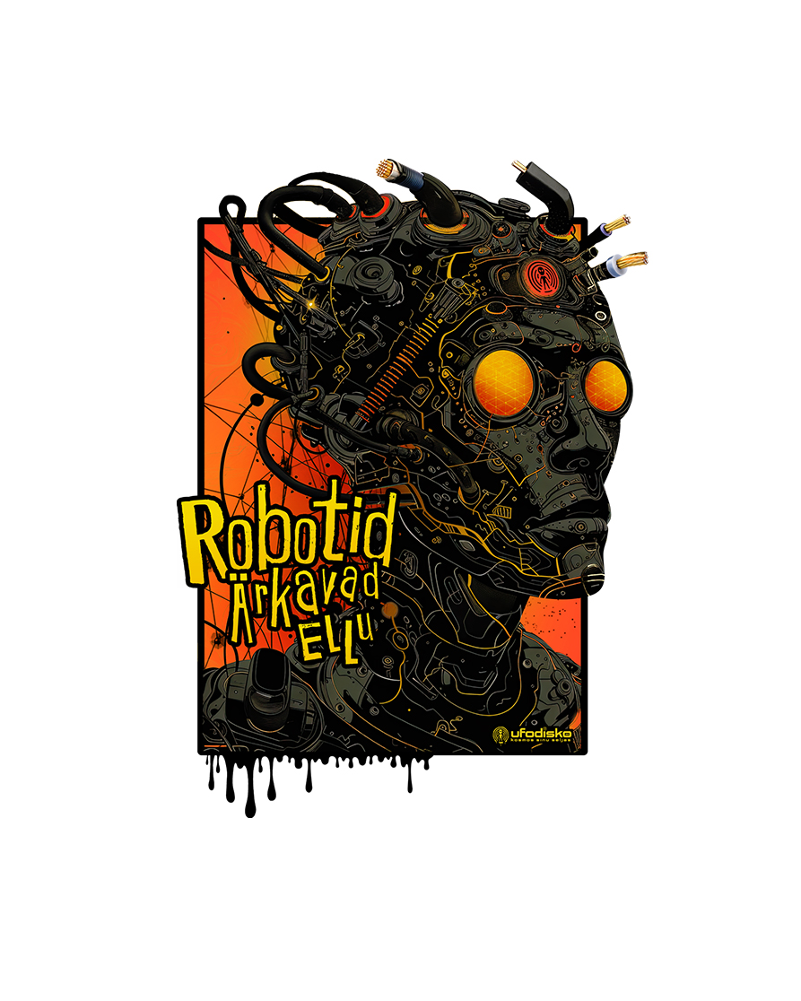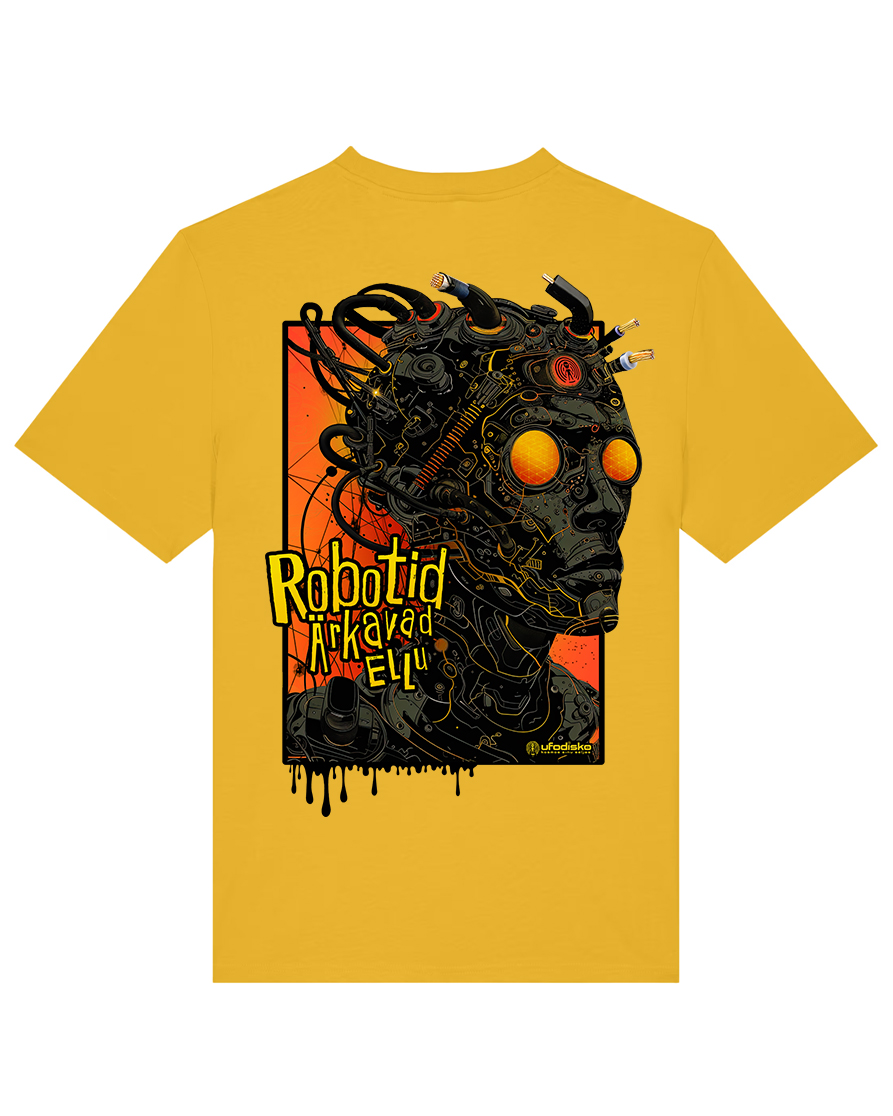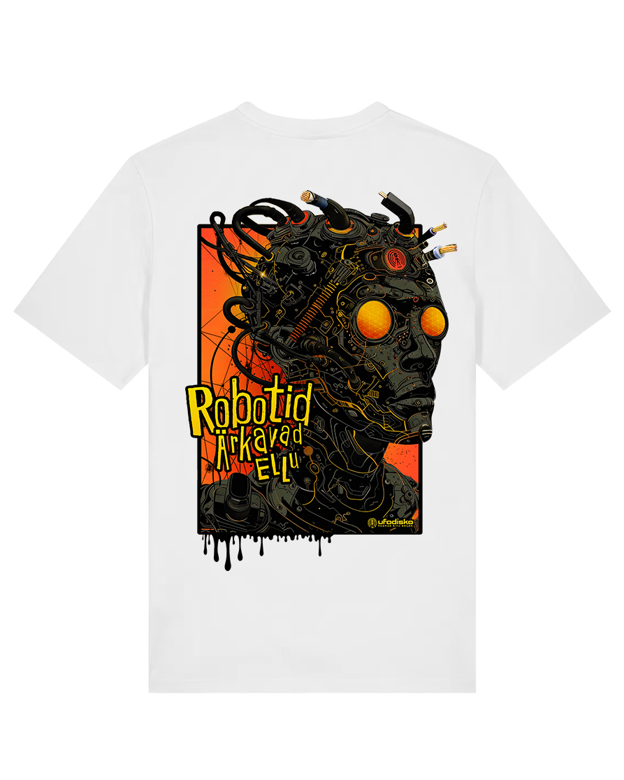 T-Särk Robotid Ärkavad Ellu. Detailne DTG print, rinnal must ufodisko logo ning seljal suurelt robotite disain. Klassikalise lõikega mugav ja kvaliteetne särk, 100% orgaaniline puuvill, 180 gms 🎧 Planeet – Robotid  – Spotify / Youtube